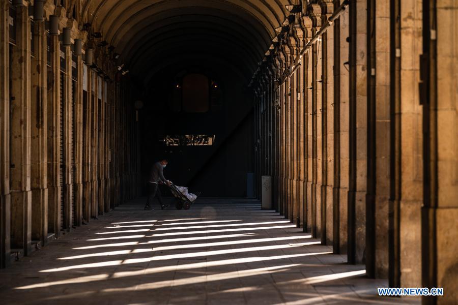 A worker carries goods at downtown Barcelona, Spain, Nov. 23, 2020. Bars and restaurants in Catalonia were allowed to reopen to the public on Monday, with the number of customers limited to less than 30% of their total capacity. (Photo by Joan Gosa/Xinhua)