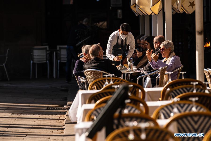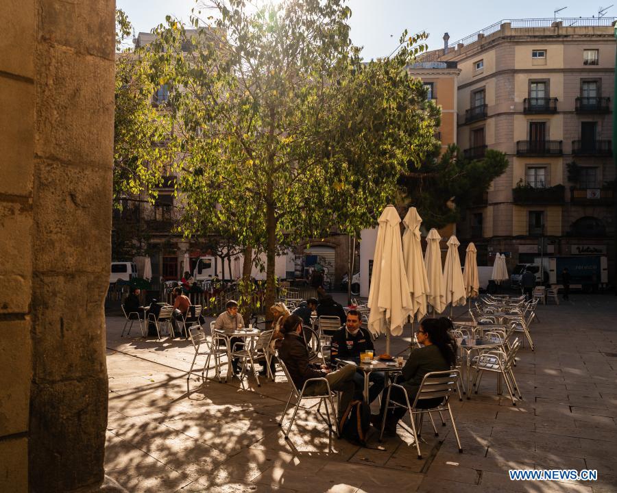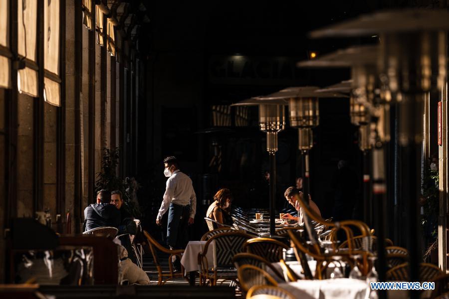 People dine at a reopened restaurant in downtown Barcelona, Spain, Nov. 23, 2020. Bars and restaurants in Catalonia were allowed to reopen to the public on Monday, with the number of customers limited to less than 30% of their total capacity. (Photo by Joan Gosa/Xinhua)