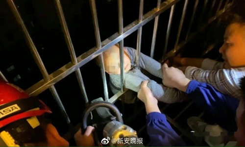 A 2-year-old boy in Hefei, East China's Anhui Province, had a lucky escape after falling from the 13th floor and being caught by a downstairs neighbor, Toutiao News reported on Monday. Photo: Xinan News