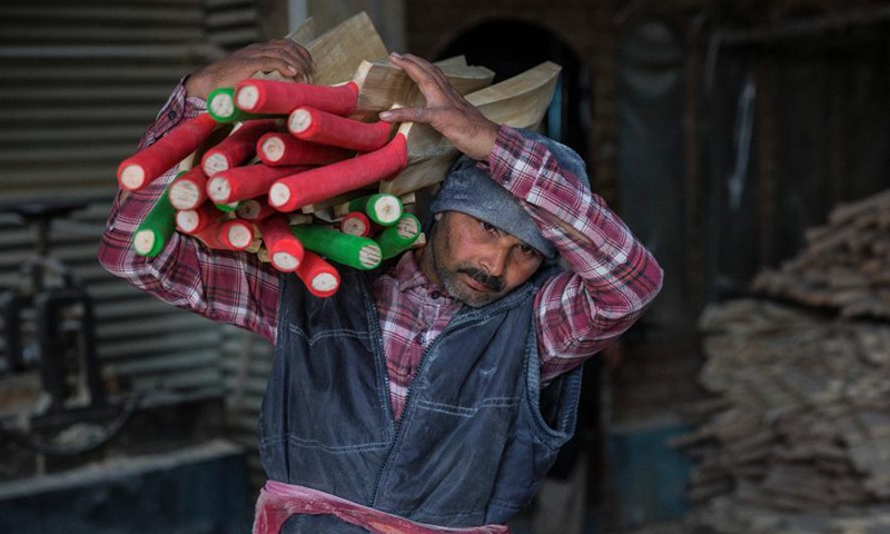 A worker carries a bunch of cricket bats at a cricket bat factory in Sangam village in south of Srinagar, the summer capital of Indian-controlled Kashmir, Nov. 24, 2020. (Xinhua/Javed Dar)