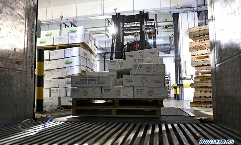 A worker unloads boxes of imported frozen meat at a cold storage at Dalian port in Dalian, northeast China's Liaoning Province, April 8, 2020. Since it resumed operation, the port has streamlined its cold chain operation attempting to achieve greater efficiency. (Xinhua/Yao Jianfeng)