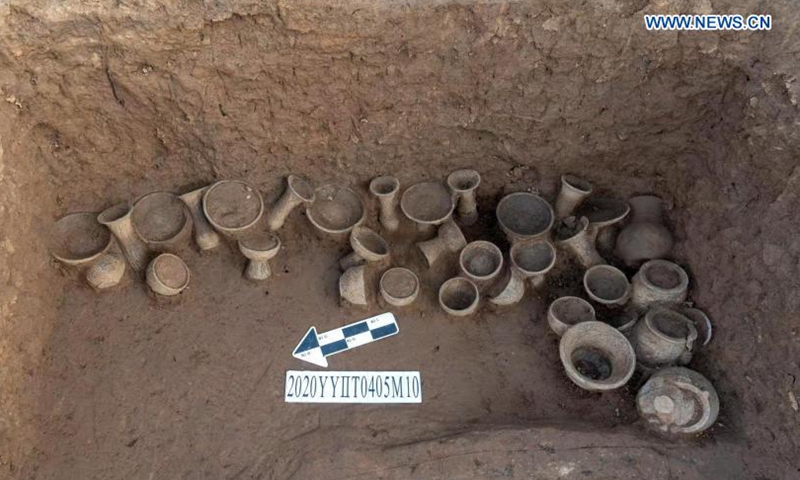 Photo taken on Nov. 3, 2020 shows earthenware grave goods excavated from the Yuzhuang Site, the ruins of a late Neolithic civilization dating back more than 4,000 years, in Yexian County, central China's Henan Province. (Henan Provincial Institute of Cultural Heritage and Archaeology/Handout via Xinhua)