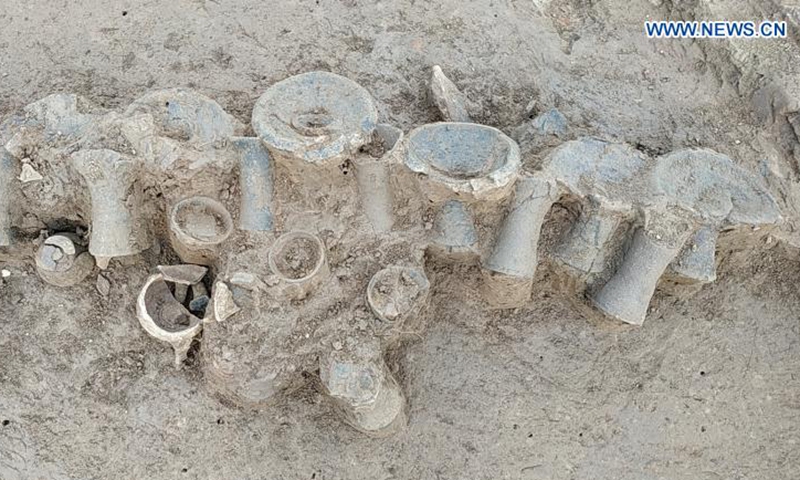 Photo taken on Nov. 3, 2020 shows earthenware objects found arranged in order from the Yuzhuang Site, the ruins of a late Neolithic civilization dating back more than 4,000 years, in Yexian County, central China's Henan Province. (Henan Provincial Institute of Cultural Heritage and Archaeology/Handout via Xinhua)