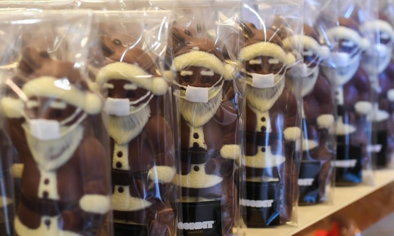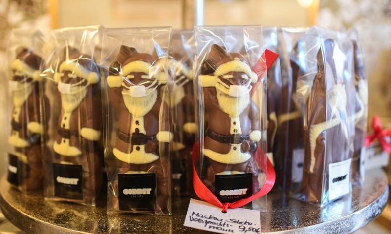 Chocolates in the shape of masked Santa Clauses are pictured at a confectionery shop during COVID-19 pandemic in Frankfurt, Germany, Nov. 25, 2020. (Xinhua/Lu Yang)