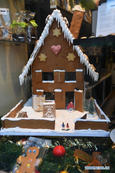 A gingerbread house with a sign reading "maximum 2 persons" is diplayed in the window of a confectionery shop during COVID-19 pandemic in Frankfurt, Germany, Nov. 25, 2020. (Xinhua/Lu Yang)