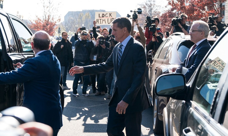 Former U.S. National Security Adviser Michael Flynn (C) leaves the federal court following his plea hearing in Washington D.C., the United States, on Dec. 1, 2017. (Xinhua/Ting Shen)