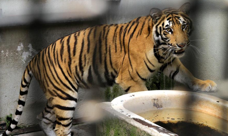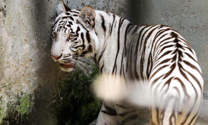 A male tiger rests in the cage at the Uganda Wildlife Education Center (UWEC) in Entebbe, Uganda, Oct. 8, 2020. Uganda on Wednesday unveiled a pair of tigers at the Uganda Wildlife Education Center (UWEC) here, 40km south of the capital Kampala. James Musinguzi, the executive director of UWEC said the animals, a male and a female, were from a South African partner zoo. They arrived in the country on March 7 and have since been under the watch of the veterinary team at UWEC. (Photo by Hajarah Nalwadda/Xinhua)
