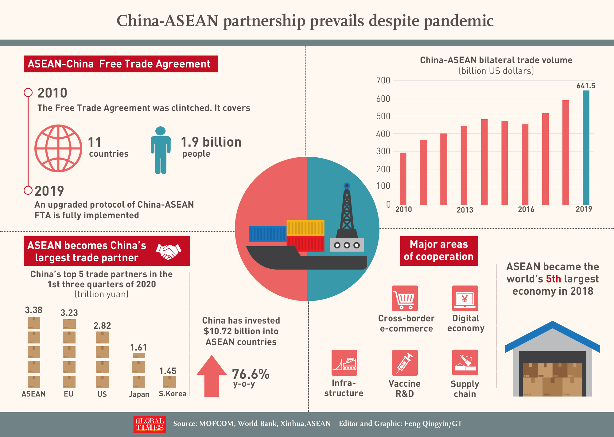 Despite the impacts of COVID-19, ASEAN has surpassed the EU to become China’s No.1 trade partner in the 1st three quarters of 2020. ASEAN–China Free Trade Agreement — covering a population of 1.9b people — has accelerated integration of both economies and created tens of thousands of jobs. Infographic:GT