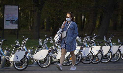 A woman wearing a face mask is seen in Warsaw, Poland on April 16, 2020. The Polish government on Thursday unveiled a multi-stage roadmap for lifting economic and social restrictions put in place to contain the COVID-19 pandemic in the country. Large events will remain banned while a recently added requirement to wear face masks in public will stay in place, according to Polish Prime Minister Mateusz Morawiecki. (Photo by Jaap Arriens/Xinhua)