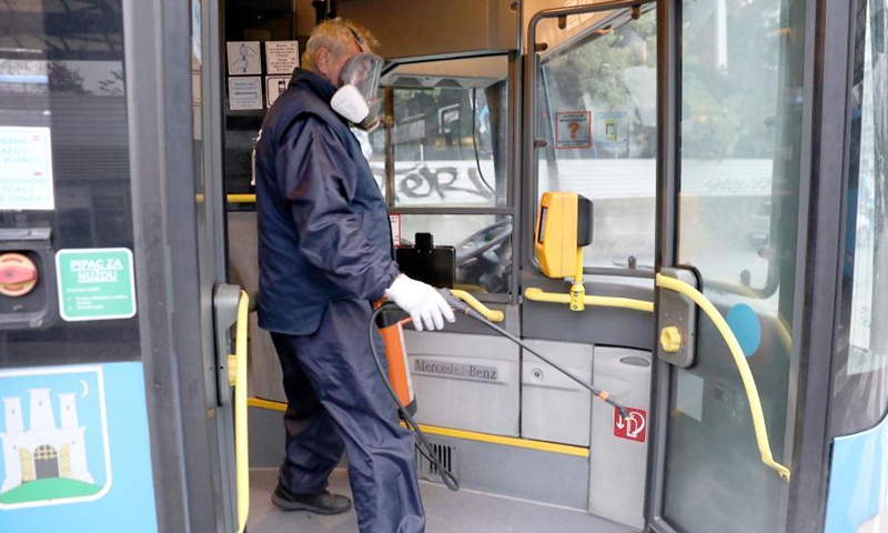 A worker disinfects a bus in Zagreb, Croatia, Nov. 26, 2020. Croatian Prime Minister Andrej Plenkovic on Thursday announced strict new measures to combat the COVID-19 pandemic, as a record high of 4,009 new cases and 51 deaths were recorded in the past 24 hours. (Patrik Macek/Pixsell via Xinhua)