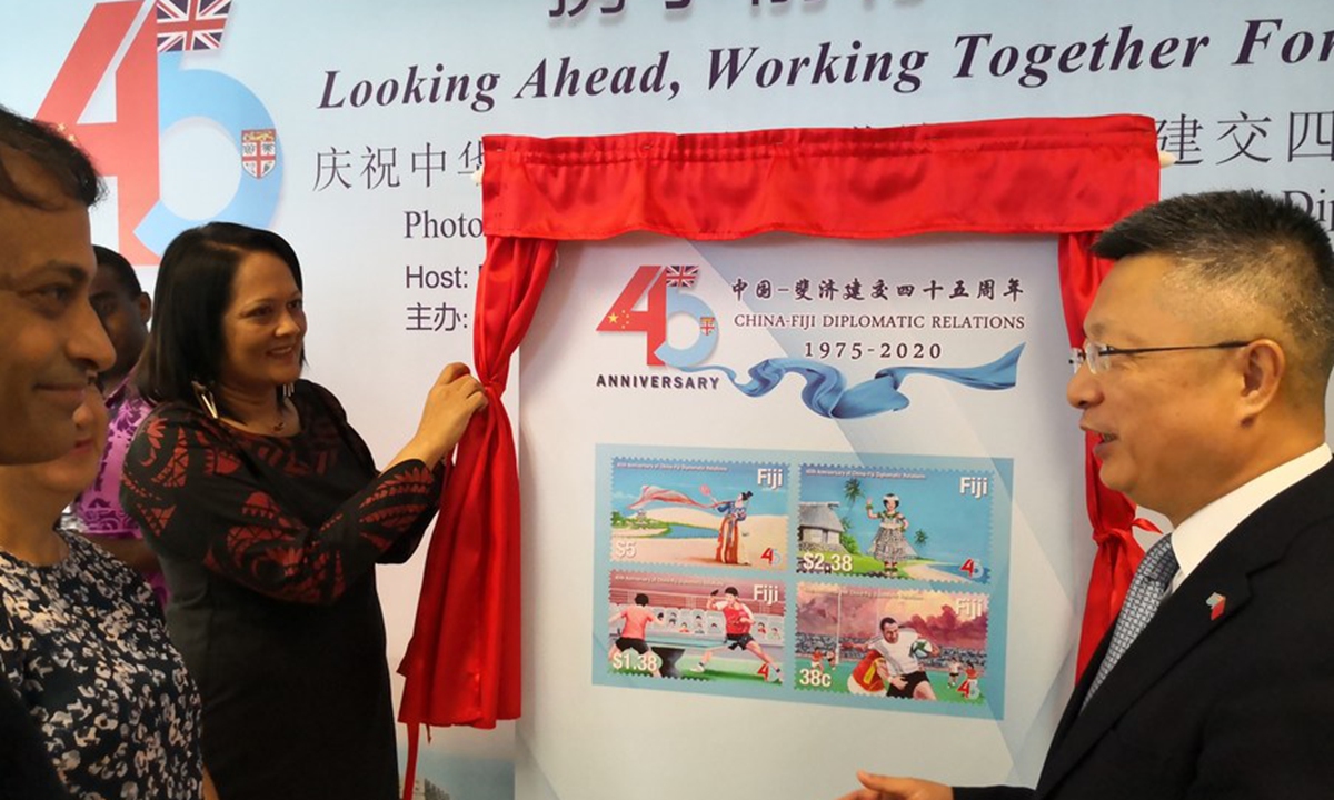 Commemorative stamps were launched on Thursday in Fiji to mark the 45th anniversary of diplomatic relations between China and Fiji.