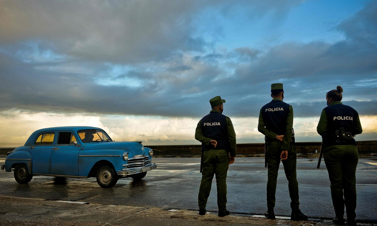 Police officers watch as the sea pounds against Havana's seawall, the Malecon, on November 9. Photo: VCG