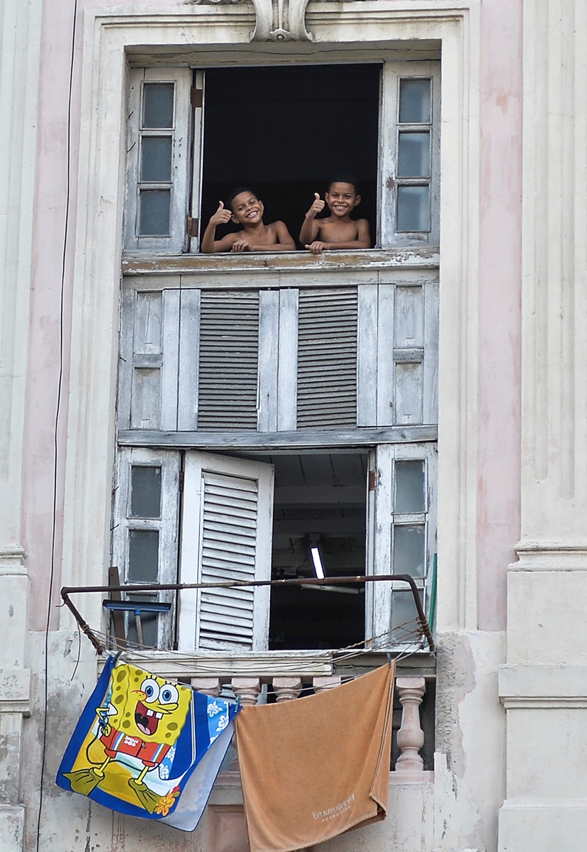 Kids gesture from a window on September 1 in Havana, Cuba. Photo: VCG
