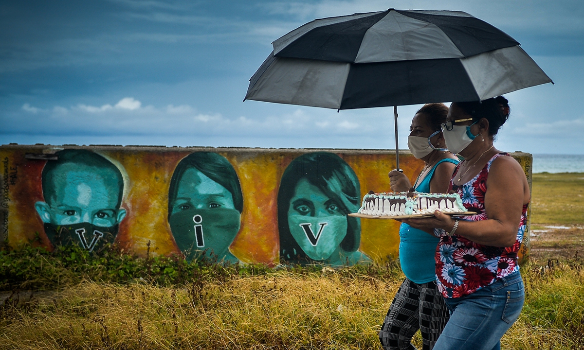 Women carry a cake in Havana, Cuba on November 9 after the passage of Tropical Storm Eta. Photo: AFP