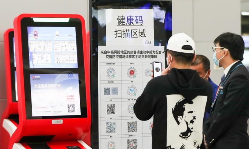 Passengers perform self-service personal health confirmation at Terminal 2 building of the Shanghai Pudong International Airport in east China's Shanghai, Nov. 24, 2020. Photo:Xinhua