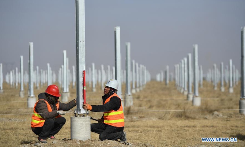 Workers work at the construction site of a photovoltaic power base in Gonghe County, northwest China's Qinghai Province, Nov. 26, 2020. Qinghai is rich in solar and wind power. So far, the total installed renewable energy power generating capacity in Hainan Tibetan Autonomous Prefecture and Haixi Mongolian and Tibetan Autonomous Prefecture has reached 15 million kilowatts and 10 million kilowatts respectively. (Xinhua/Zhang Hongxiang)