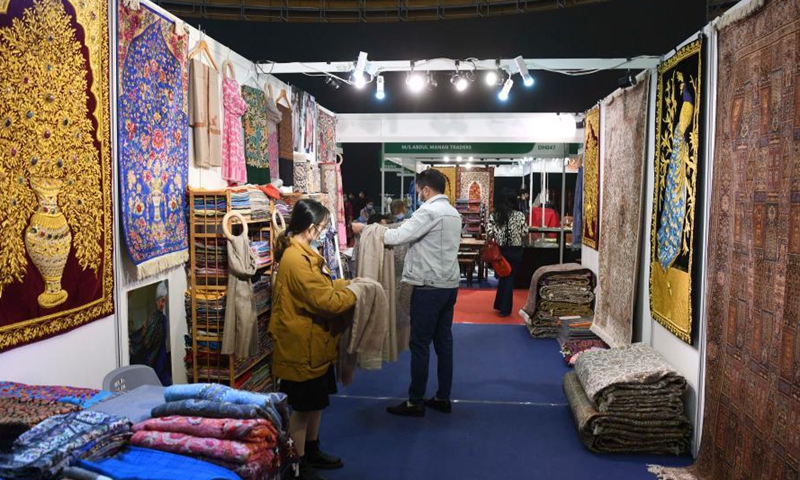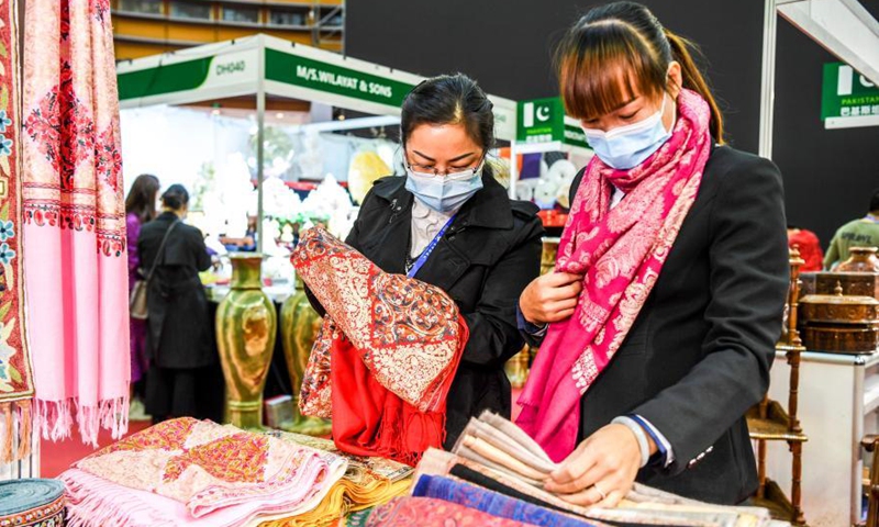 Visitors shop at a Pakistani exhibition area of the 17th China-ASEAN Expo at Nanning International Convention and Exhibition Center in Nanning, south China's Guangxi Zhuang Autonomous Region, Nov. 28, 2020. The expo runs from Nov. 27 to 30 in Nanning. (Xinhua/Lu Boan)