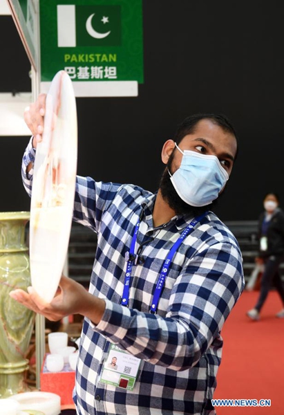 Photo taken on Nov. 28, 2020 shows a Pakistani exhibition area of the 17th China-ASEAN Expo at Nanning International Convention and Exhibition Center in Nanning, south China's Guangxi Zhuang Autonomous Region. The expo runs from Nov. 27 to 30 in Nanning. (Xinhua/Zhang Ailin)
