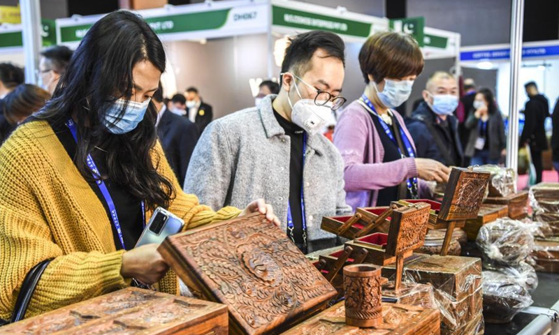 Visitors shop at a Pakistani exhibition area of the 17th China-ASEAN Expo at Nanning International Convention and Exhibition Center in Nanning, south China's Guangxi Zhuang Autonomous Region, Nov. 28, 2020. The expo runs from Nov. 27 to 30 in Nanning. (Xinhua/Cao Yiming)