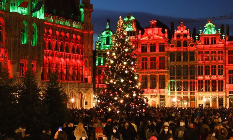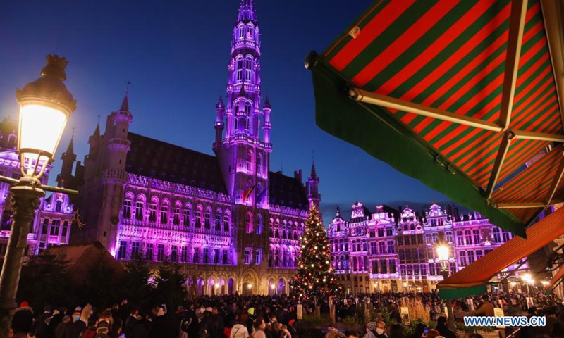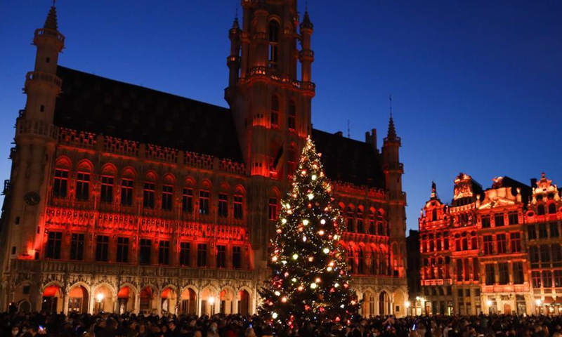 People visit the Grand Place decorated with a Christmas tree in Brussels, Belgium, on Nov. 28, 2020. The Christmas tree at the Grand Place of Brussels was decorated in the theme of "renewal" this year. (Xinhua/Zheng Huansong)