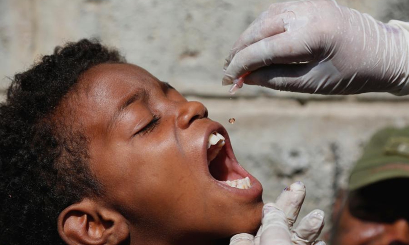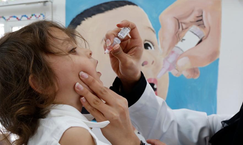 A medical worker gives a child a dose of polio vaccine in Sanaa, Yemen, on Nov. 28, 2020. Yemen's health authorities on Saturday launched a polio vaccination campaign for more than 4 million children in the north of the war-torn country. The three-day campaign is supported by the World Health Organization, the UNICEF and other international aid agencies, the local health authorities said in a statement. (Photo by Mohammed Mohammed/Xinhua)