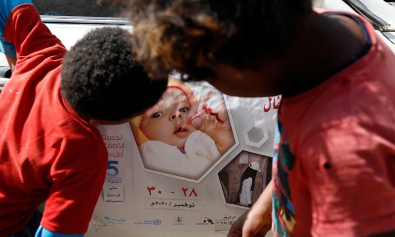 Children look at a poster promoting the polio vaccination in Sanaa, Yemen, on Nov. 28, 2020. Yemen's health authorities on Saturday launched a polio vaccination campaign for more than 4 million children in the north of the war-torn country. The three-day campaign is supported by the World Health Organization, the UNICEF and other international aid agencies, the local health authorities said in a statement. (Photo by Mohammed Mohammed/Xinhua)