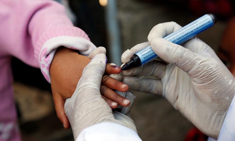 A medical worker marks a child's finger after giving her a dose of polio vaccine in Sanaa, Yemen, on Nov. 28, 2020. Yemen's health authorities on Saturday launched a polio vaccination campaign for more than 4 million children in the north of the war-torn country. The three-day campaign is supported by the World Health Organization, the UNICEF and other international aid agencies, the local health authorities said in a statement. (Photo by Mohammed Mohammed/Xinhua)