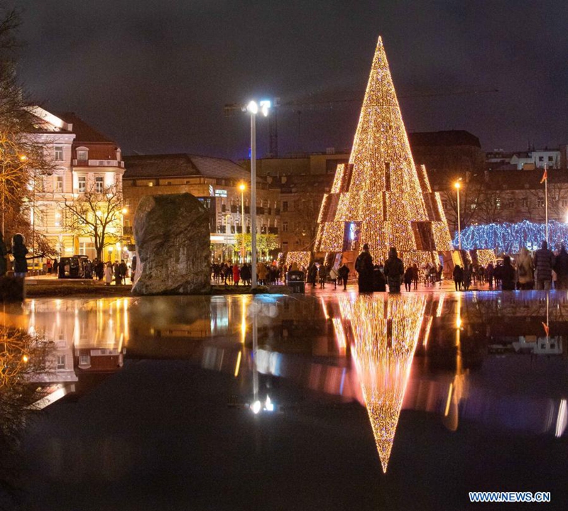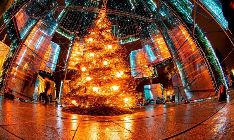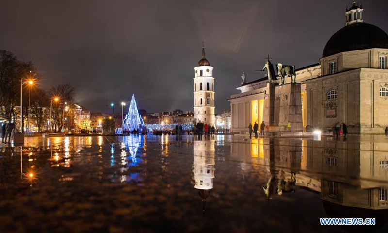 The main Christmas tree is lit up at Cathedral Square in Vilnius, Lithuania, Nov. 28, 2020. The annual lighting of the Vilnius' Christmas tree was held on Saturday evening, officially kicking off the holiday season celebrations in the Lithuanian capital. (Photo by Alfredas Pliadis/Xinhua)