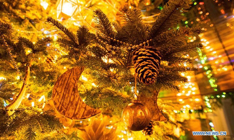Decorations are seen on the main Christmas tree lit up at Cathedral Square in Vilnius, Lithuania, Nov. 28, 2020. The annual lighting of the Vilnius' Christmas tree was held on Saturday evening, officially kicking off the holiday season celebrations in the Lithuanian capital. (Photo by Alfredas Pliadis/Xinhua)