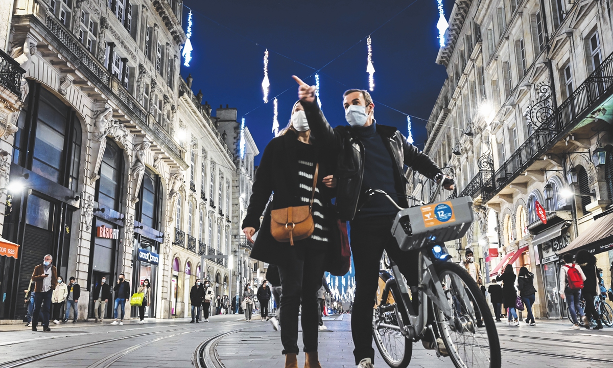 A man and a woman stand under Christmas decorations as people do shopping in Bordeaux, France on Saturday. Photo: AFP