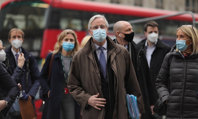European Union (EU) chief negotiator Michel Barnier (C) leaves after trade talks with Britain in London, Britain, on Nov. 28, 2020. Britain and the European Union (EU) resumed face-to-face trade talks in London on Saturday. (Photo: Xinhua)