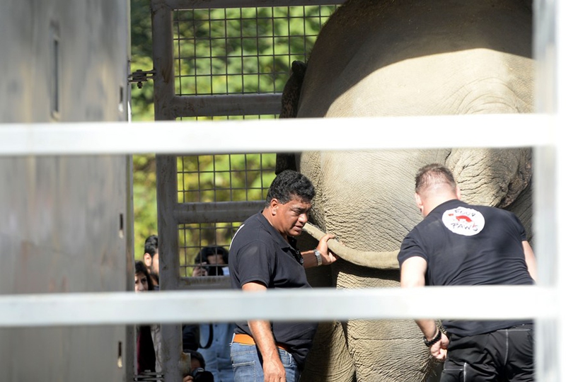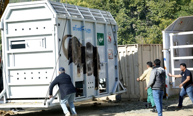 Officials of Four Paws International check Kaavan, Pakistan's only Asian elephant into a crate at the Marghazar Zoo in Islamabad, capital of Pakistan on Nov. 29, 2020. (Photo: Xinhua)