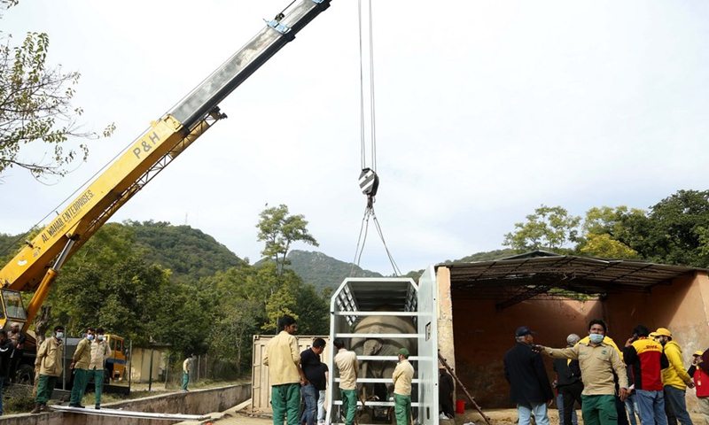 Officials move Kaavan, Pakistan's only Asian elephant into a crate at the Marghazar Zoo in Islamabad, capital of Pakistan on Nov. 29, 2020. (Photo: Xinhua)