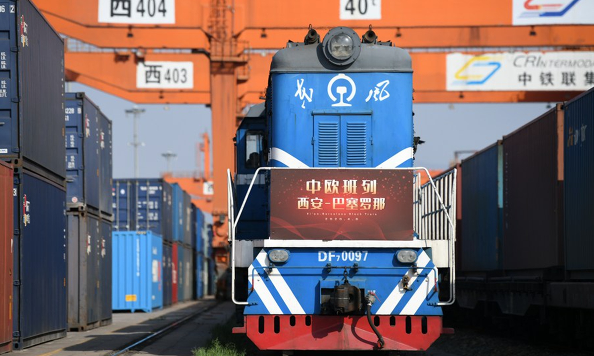 File photo taken on April 8, 2020 shows a China-Europe freight train bound for Barcelona of Spain waiting for departure in Xi'an, northwest China's Shaanxi Province. (Xinhua/Li Yibo)