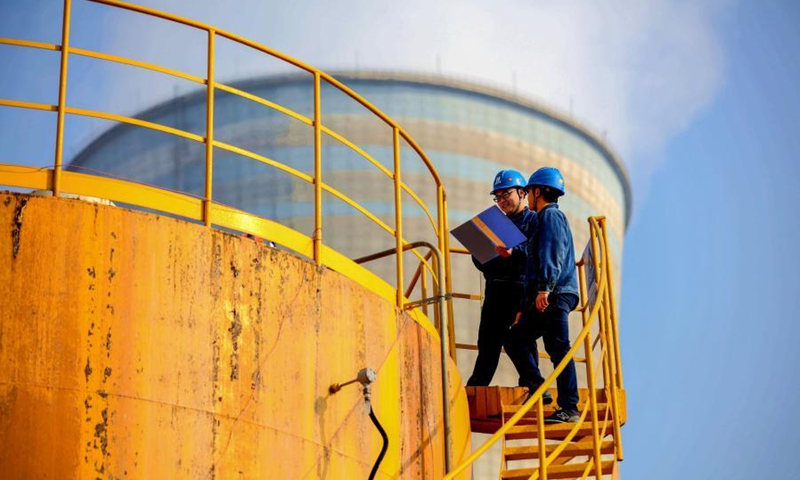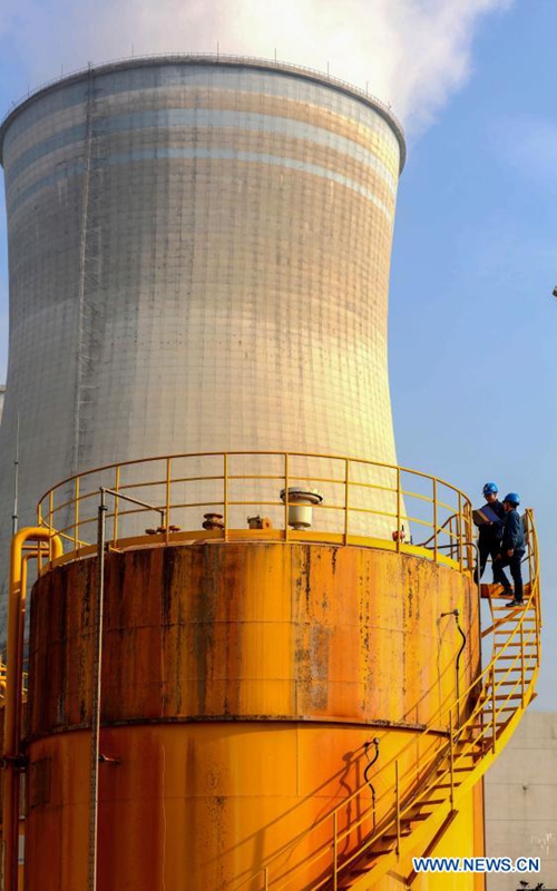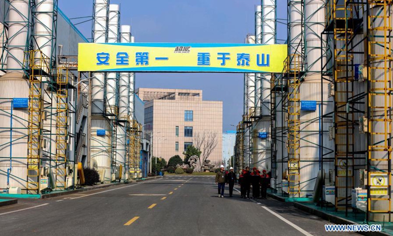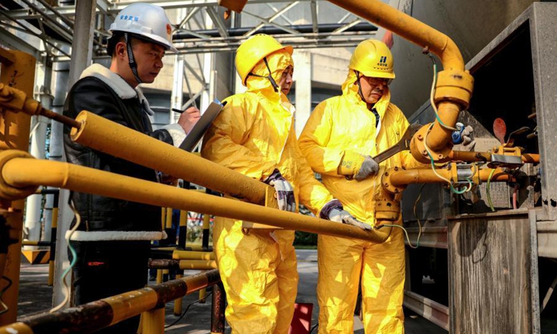 Staff members from the local emergency management center carry out inspection on production facilities to ensure production safety in Changxing County of Huzhou, east China's Zhejiang Province, Nov. 30, 2020. (Xinhua/Xu Yu)