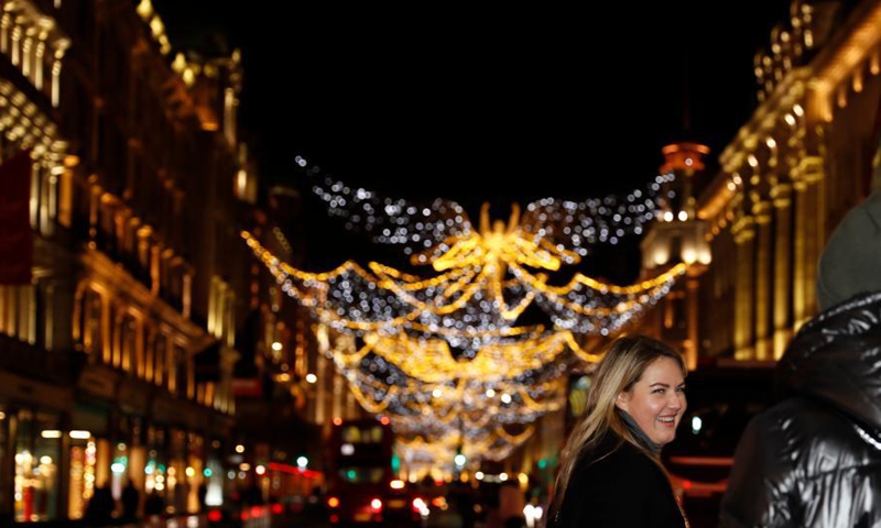 A woman walks on Regent Street decorated with Christmas lights in central London, Britain, on Nov. 30, 2020. (Xinhua/Han Yan)