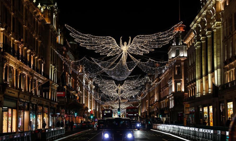 Christmas lights are seen over Regent Street in central London, Britain, on Nov. 30, 2020. (Xinhua/Han Yan)