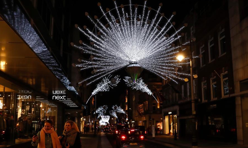People walk along New Bond Street decorated with Christmas lights in central London, Britain, on Nov. 30, 2020. (Xinhua/Han Yan)