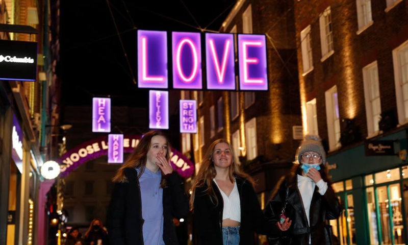 People walk along Carnaby Street with Christmas decorations in central London, Britain, on Nov. 30, 2020. (Xinhua/Han Yan)
