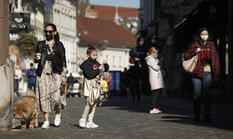 People wearing face masks walk on a street in the old town, Ljubljana, Slovenia, Oct. 30, 2020.(Photo: Xinhua)