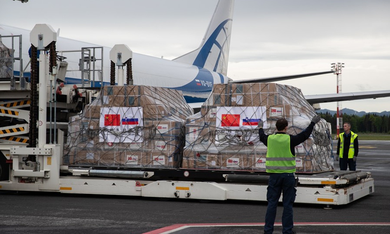 Airport staff members unload Chinese medical supplies in Ljubljana, Slovenia, May 1, 2020. (Photo: Xinhua)