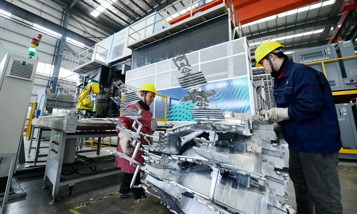 Workers are seen at the factory of an auto parts producer in Hai'an, East China's Jiangsu Province on Wednesday. The company has invested more than 30 million yuan ($4.57 million) to buy intelligent die-casting equipment from Switzerland, mainly for the production of high-strength lightweight components for automobile manufacturers, including Tesla and Geely. Photo: cnsphoto