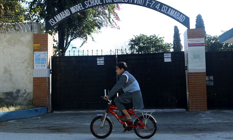 A boy rides past a closed school in Islamabad, Pakistan on Nov. 26, 2020. Pakistan closed educational institutions till Jan. 10 next year following rises in the cases of COVID-19.(Photo: Xinhua)