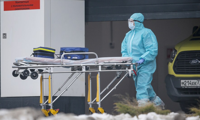 A medical worker wearing protective gear pushes a trolley at a hospital in Kommunarka outside Moscow, Russia, on Nov. 27, 2020.(Photo: Xinhua)
