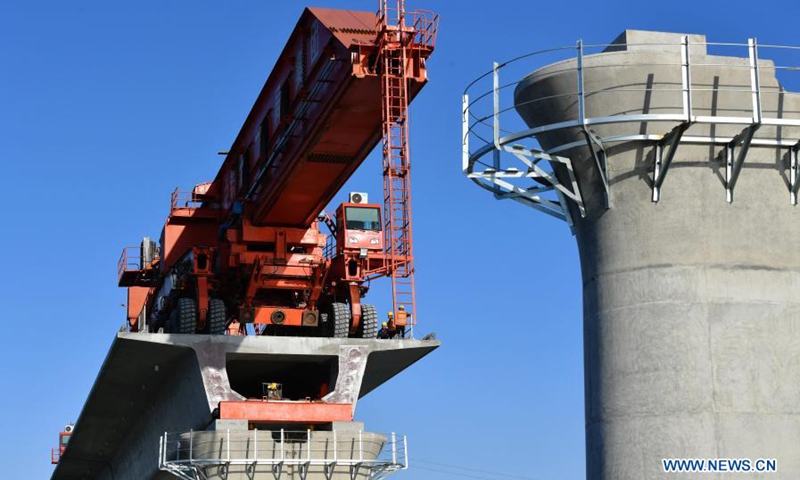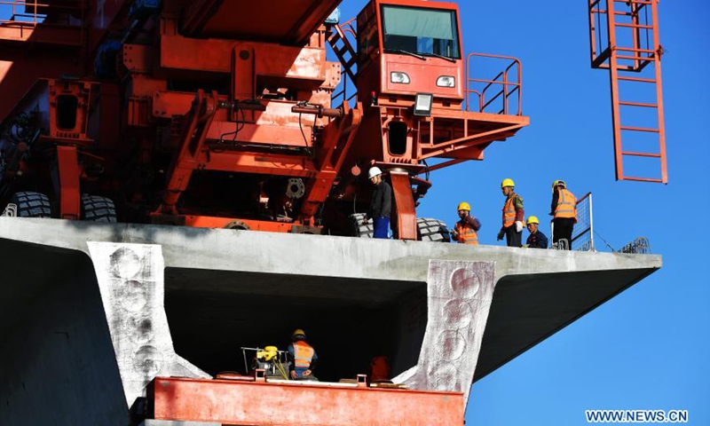 Laborers work at the construction site of Meizhou Bay cross-sea bridge of the Fuzhou-Xiamen high-speed railway in southeast China's Fujian Province, Dec. 2, 2020. The 14.7-km-long bridge is part of the province's Fuzhou-Xiamen high-speed railway, the first cross-sea high-speed railway in China, which is expected to be put into operation in 2022. (Photo: Xinhua)