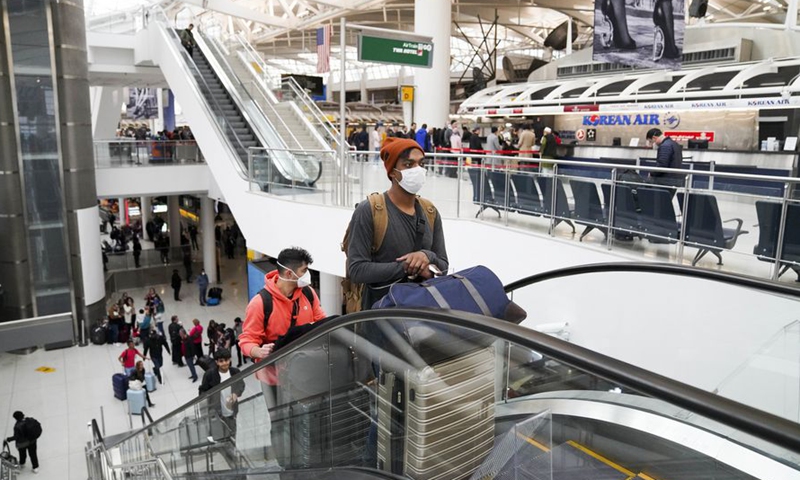 Passengers take an escalator at John F. Kennedy International Airport in New York, the United States, March 13, 2020.File photo:Xinhua