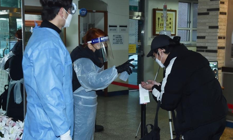 An examinee gets his hands sanitized before attending the College Scholastic Ability Test (CSAT) in Seongnam City of Gyeonggi Province, South Korea, Dec. 3, 2020. South Korean students took the annual CSAT on Thursday amid a sharp resurgence of COVID-19 infections across the country. (Photo by Lee Sang-ho/Xinhua)