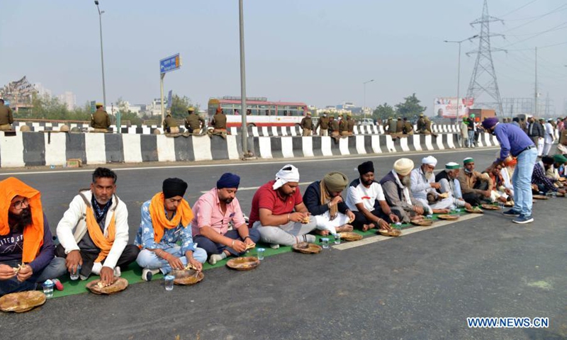 Indian farmers have lunch at a flyover on the border between New Delhi and Uttar Pradesh during the 9th day of protest against the new farm laws on Dec. 4, 2020. (Xinhua/Partha Sarkar)