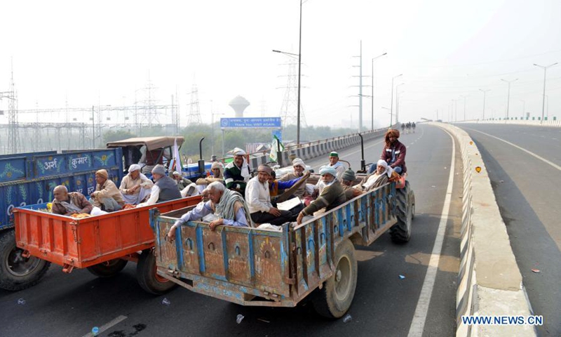 Indian farmers sit on their tractors used as roadblocks on the border between New Delhi and Uttar Pradesh during the 9th day of protest against the new farm laws, Dec. 4, 2020. (Xinhua/Partha Sarkar)