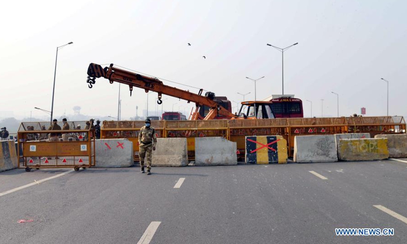 Indian police personnel stand guard at the blocked border between New Delhi and Uttar Pradesh during the 9th day of farmers protest against the new farm laws on Dec. 4, 2020. (Xinhua/Partha Sarkar)